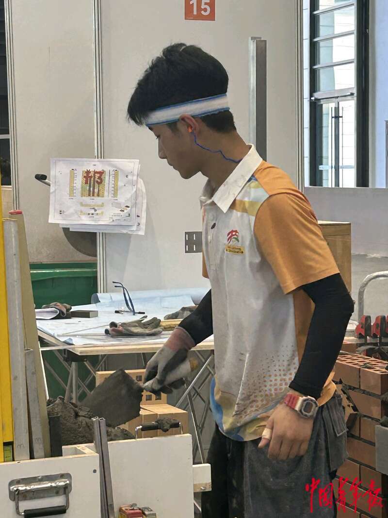 9月21日,郑州航空港区中原国际会展中心,陕西选手牟康明正在参加第三届全国技能大赛砌筑赛项。在比赛中,选手们需要运用砌刀、水平仪等工具,在限定时间内精准完成铺浆、放砖、造型、磨平等工序。中青报·中青网记者 李桂杰/摄