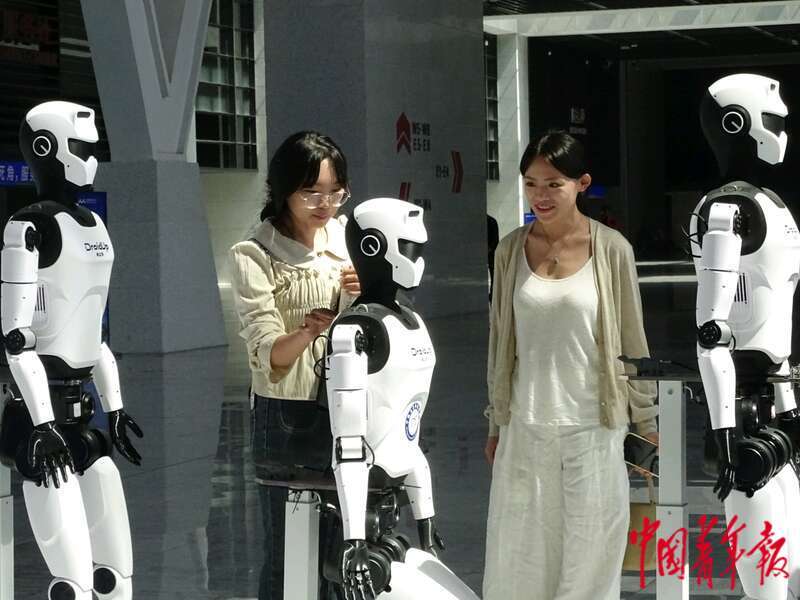 9月20日,郑州航空港区中原国际会展中心,两位参观者饶有兴味地与机器人进行互动。中青报·中青网记者 李桂杰/摄