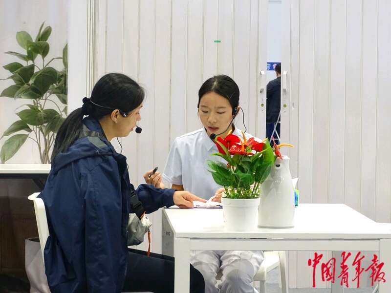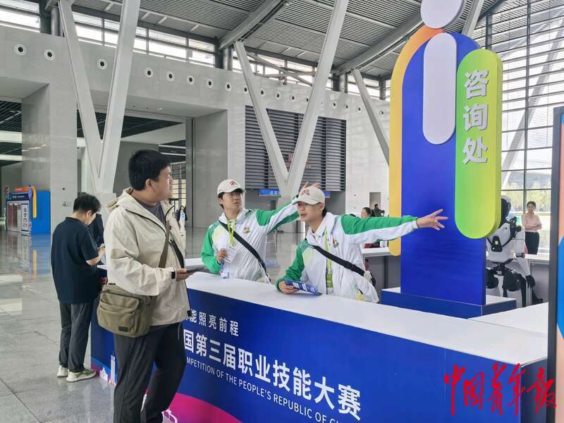 9月21日,郑州航空港区中原国际会展中心,第三届全国技能大赛咨询处志愿者正在服务前来参观比赛的观众。中青报·中青网记者 李瑞璇/摄