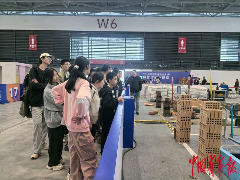 9月21日,郑州航空港区中原国际会展中心,第三届全国技能大赛观众正在观看砌筑比赛。中青报·中青网记者 李瑞璇/摄