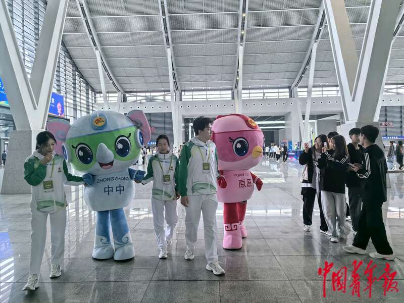 9月21日,郑州航空港区中原国际会展中心,第三届全国技能大赛吉祥物人偶中中和原原正在与路过年轻人打招呼。中青报·中青网记者李瑞璇/摄