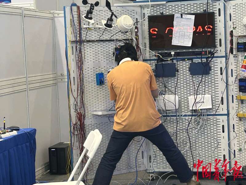 9月21日,郑州航空港区中原国际会展中心,第三届全国技能大赛物联网安装调试赛项,一名选手正在紧张比赛中。中青报·中青网记者 李桂杰/摄
