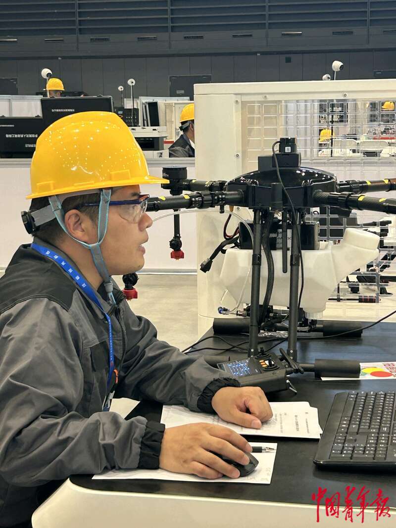 9月20日,郑州航空港区中原国际会展中心,第三届全国技能大赛无人机驾驶(植保)赛项,一名参赛选手正在比赛中。中青报·中青网记者 李桂杰/摄