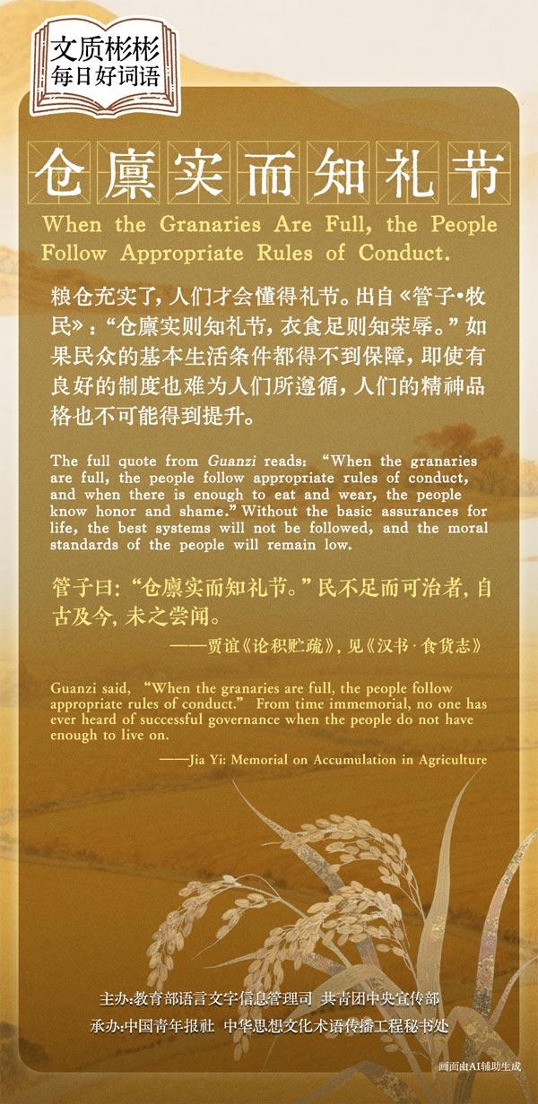 粮仓充实了,人们才会懂得礼节。出自《管子·牧民》:“仓廪实则知礼节,衣食足则知荣辱。”如果民众的基本生活条件都得不到保障,即使有良好的制度也难为人们所遵循,人们的精神品格也不可能得到提升。