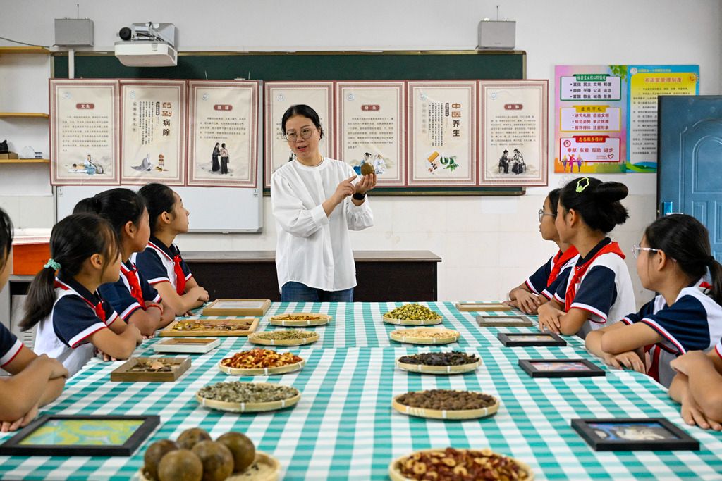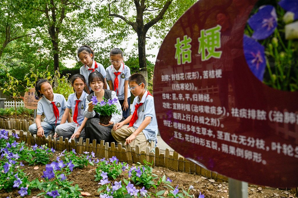 2025年9月23日,安徽合肥,庐阳区五一小学校园“百草园”内,小学生在中医药老师指导下学习种植中草药。