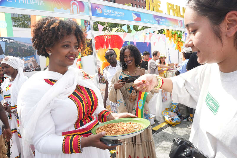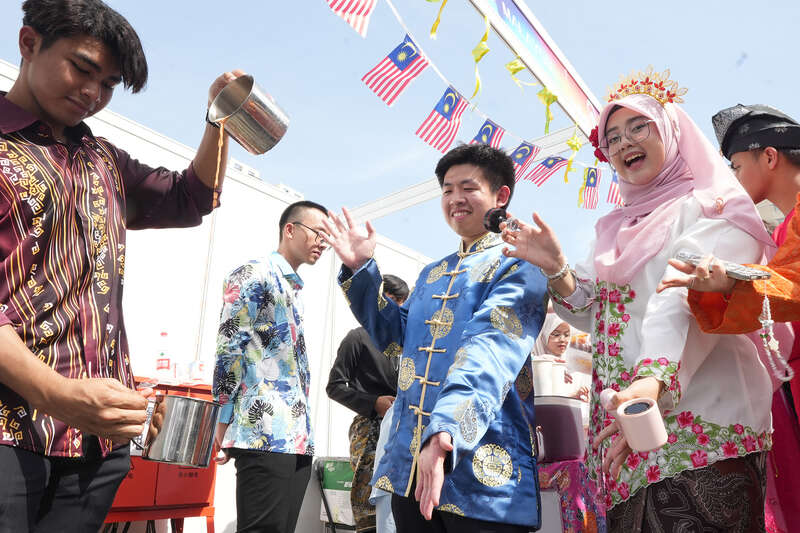 文化展台区域同样精彩纷呈。来自40个国家的留学生化身文化使者,身着家乡服饰“变身”摊主,精心布置本国展台。美食体验区飘散着异国风味,护照打卡点记录着环球足迹,文化展示区陈列着特色手工艺品,传统游戏区洋溢着欢声笑语——师生们在此可“一站式”开启环球旅行,感受多元文化碰撞交融的独特魅力。