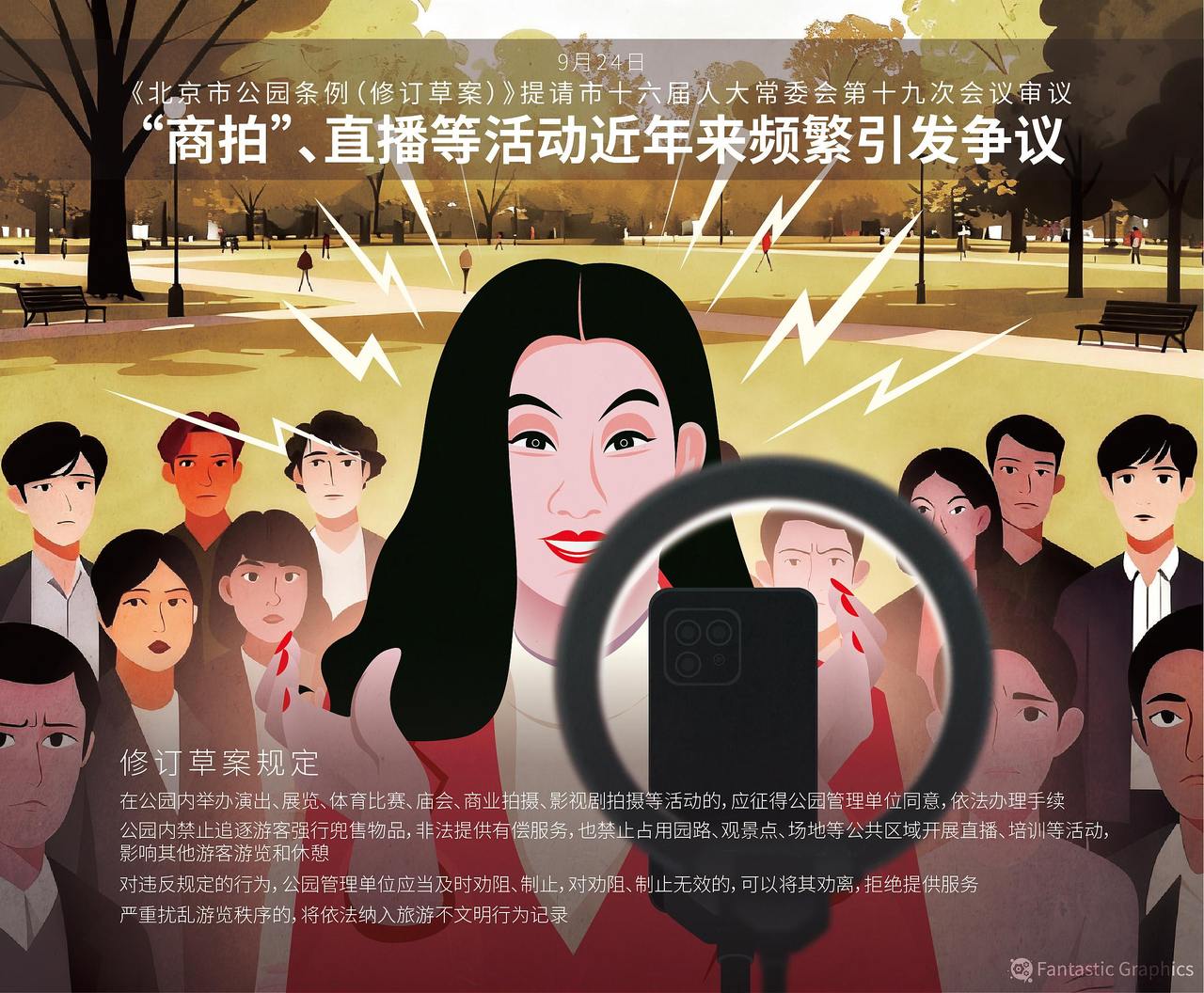 近日,《北京市公园条例(修订草案)》已提请市十六届人大常委会第十九次会议审议。修订草案在明确本市公园实行分类管理的基础上,对搭建帐篷、噪声污染、准入车辆、商业拍摄等多项市民关心的游园行为进行了细化规定。其中明确提到,禁止占用园路、观景点、场地等公共区域开展直播、培训等活动,直指市民游园痛点,引发广泛关注。