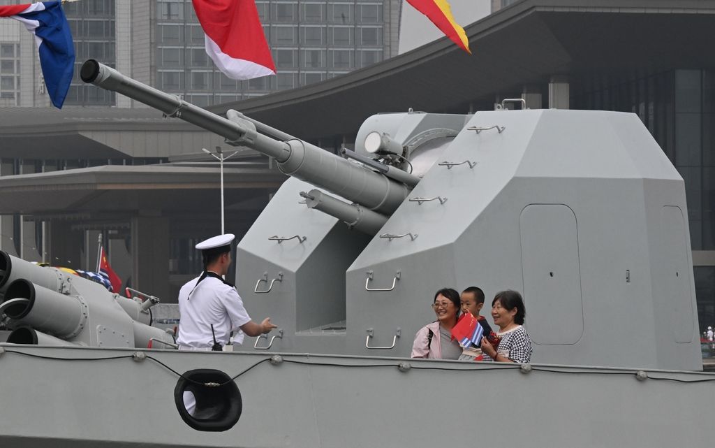 2025年9月24日,青岛,观众在公开展示的海军芜湖舰上留影。