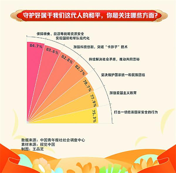 守护好属于我们这代人的和平,84.7%的受访者关注保障粮食、能源等战略资源安全,83.6%的受访者关注实现国防和军队现代化,把人民军队建成世界一流军队,82.8%的受访者关注加强科技创新,突破“卡脖子”技术,82.7%的受访者关注持续解决社会矛盾和社会问题,推动共同富裕。
