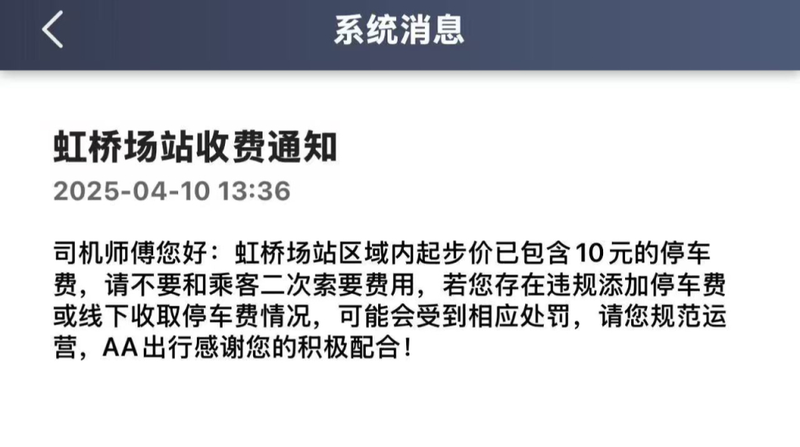 网约车王师傅称高德平台上个别服务商会以文字形式提示司机订单已包含停车费,起步价会略高于其他平台。比如AA出行规定,虹桥场站区域内起步价已包含10元的停车费,请不要和乘客二次索要费用,若您存在违规添加停车费或线下收取停车费情况,可能会受到相应处罚。
