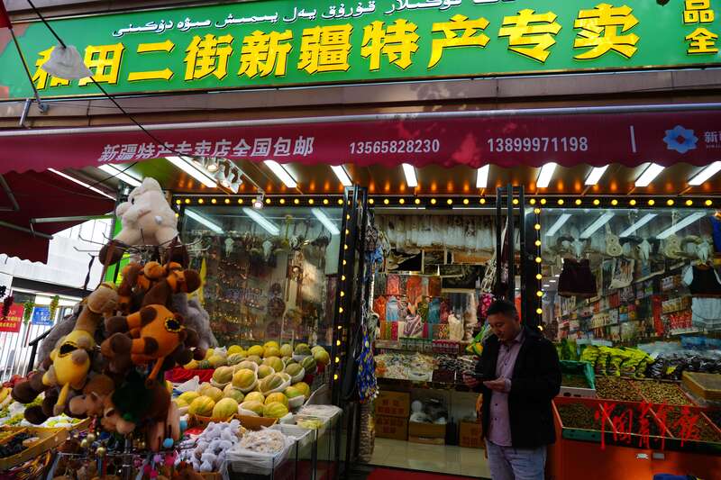 9月25日上午,新疆乌鲁木齐,和田二街新疆特产专卖门口,老板麦麦提伊力·阿卜力子用手机观看新疆维吾尔自治区成立70周年庆祝大会的直播。中青报·中青网记者 王雪迎/摄