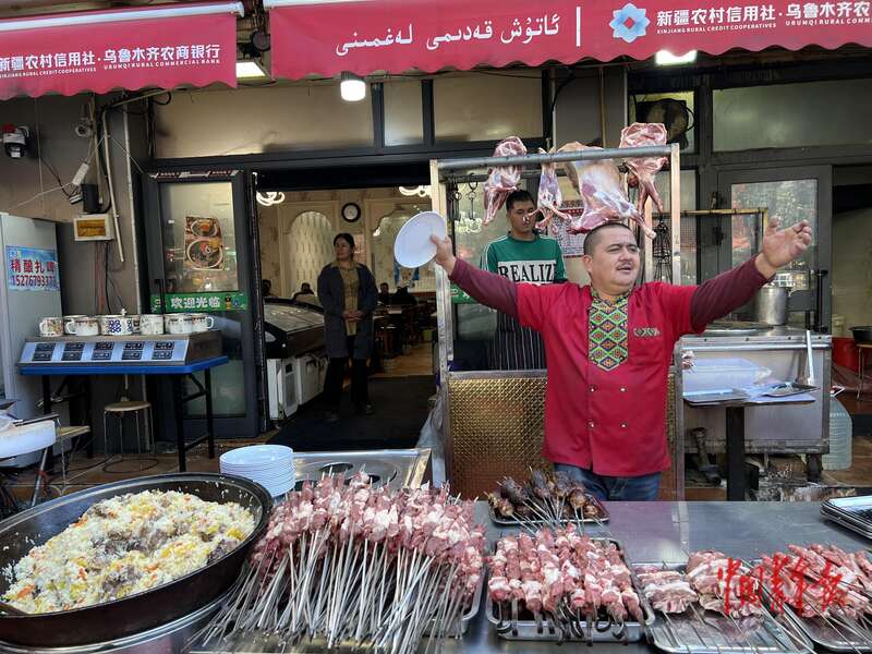 9月25日上午,新疆乌鲁木齐,在和田二街阿图什拌面王门前,烤全羊、抓饭、缸子肉、烤肉的香气交织在一起,混合着老板玉素甫江·克依木的洪亮吆喝声,吸引食客驻足品尝。动感的维吾尔语乐曲响起,38岁的玉素甫江·克依木转动脖颈、抖动双肩开始舞动,不时地把手中的盘子抛到空中,再稳稳地接住。这欢乐的场景,总会成为过路游客眼中的惊喜。中青报·中青网记者 王雪迎/摄