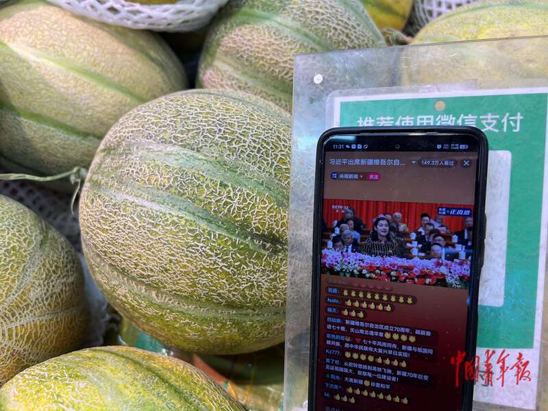 9月25日上午,新疆乌鲁木齐,和田二街水果摊员工麦麦提热依木·玉苏云竖立在老汉瓜堆上的手机直播屏幕画面。 中青报·中青网记者 王雪迎/摄