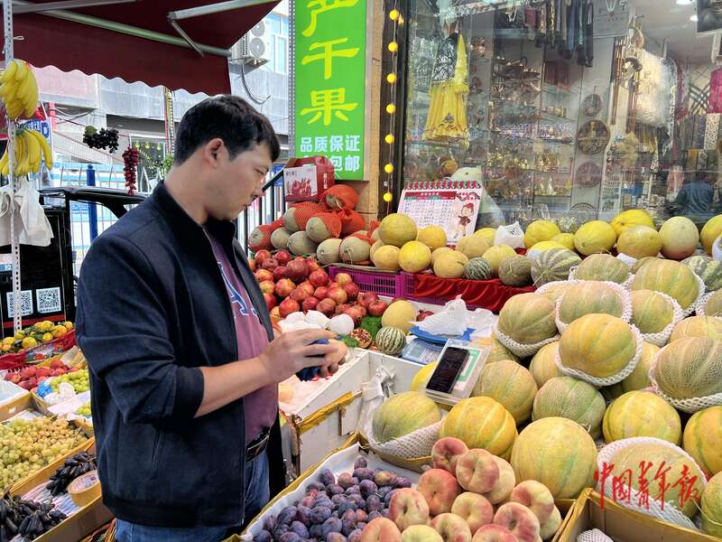 9月25日上午,新疆乌鲁木齐,和田二街水果摊员工麦麦提热依木·玉苏云一边擦拭着蟠桃,一边盯着竖立在老汉瓜堆上的手机屏幕,观看新疆维吾尔自治区成立70周年庆祝大会直播。他来自喀什地区英吉沙县,从小和父亲学习英吉沙小刀制作技艺,去年夏天,他决定转换人生赛道,来到乌鲁木齐市和田二街发展。中青报·中青网记者 王雪迎/摄