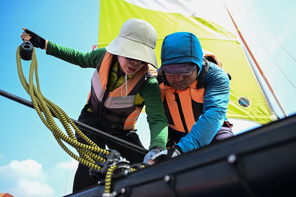 2025年9月27日,选手作赛前准备。当日,2025中国家庭帆船赛・杭州站在浙江杭州临安青山湖拉开帷幕,来自北京、上海、武汉等10个城市的40组家庭近百名选手在绿水青山间扬帆。 中新社记者 王刚 摄