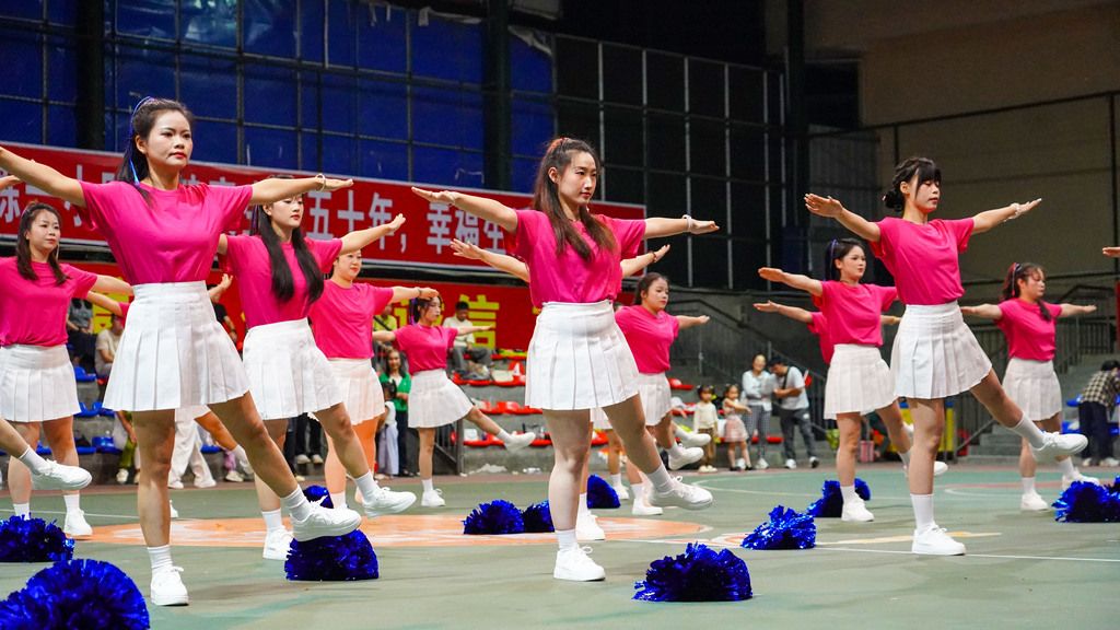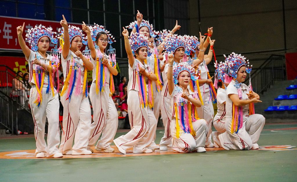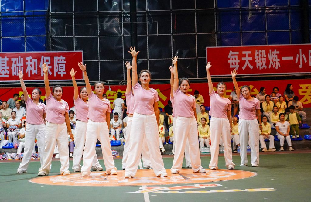 2025年9月26日,贵州从江,参赛代表队在从江县第五中学篮球场内参加工间操比赛。