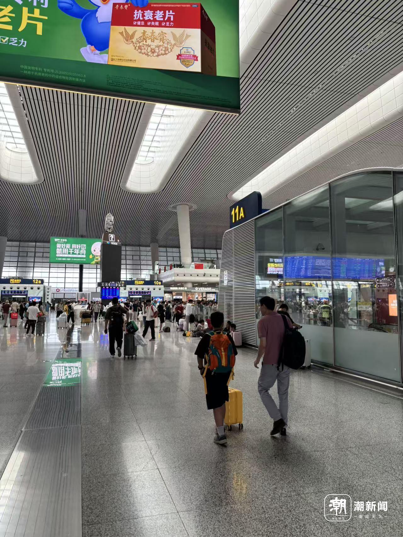 候车大厅小朋友越来越多,拉着行李箱飞奔,有些还穿着校服。