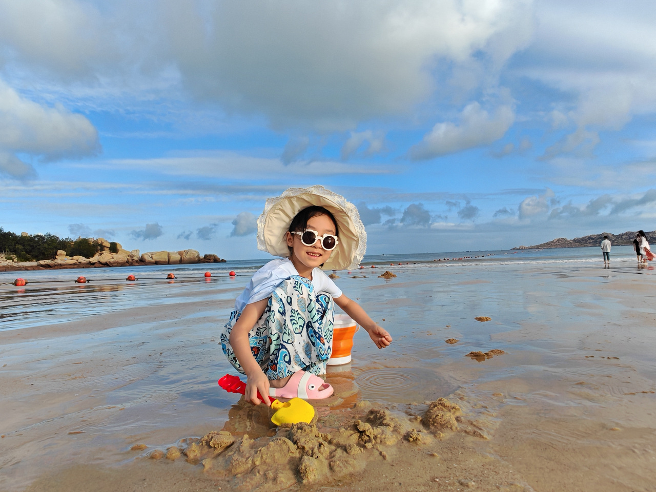 今天上午,可可同学一家已抵达杭州东站,坐上高铁前往平潭看海。今天下午,可可已经在海边玩沙啦!