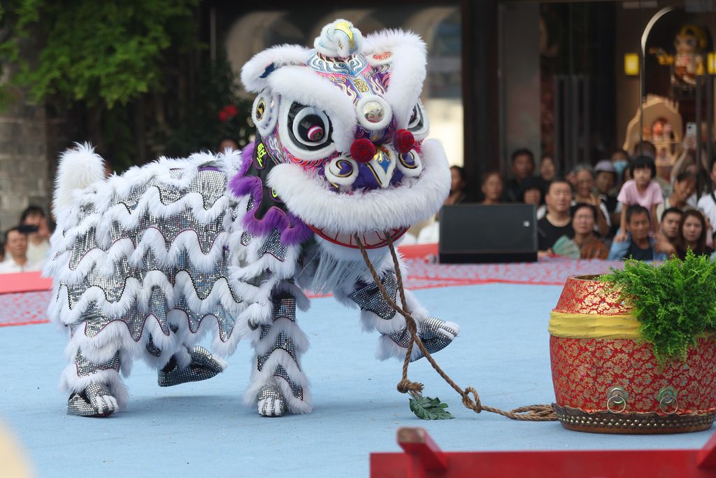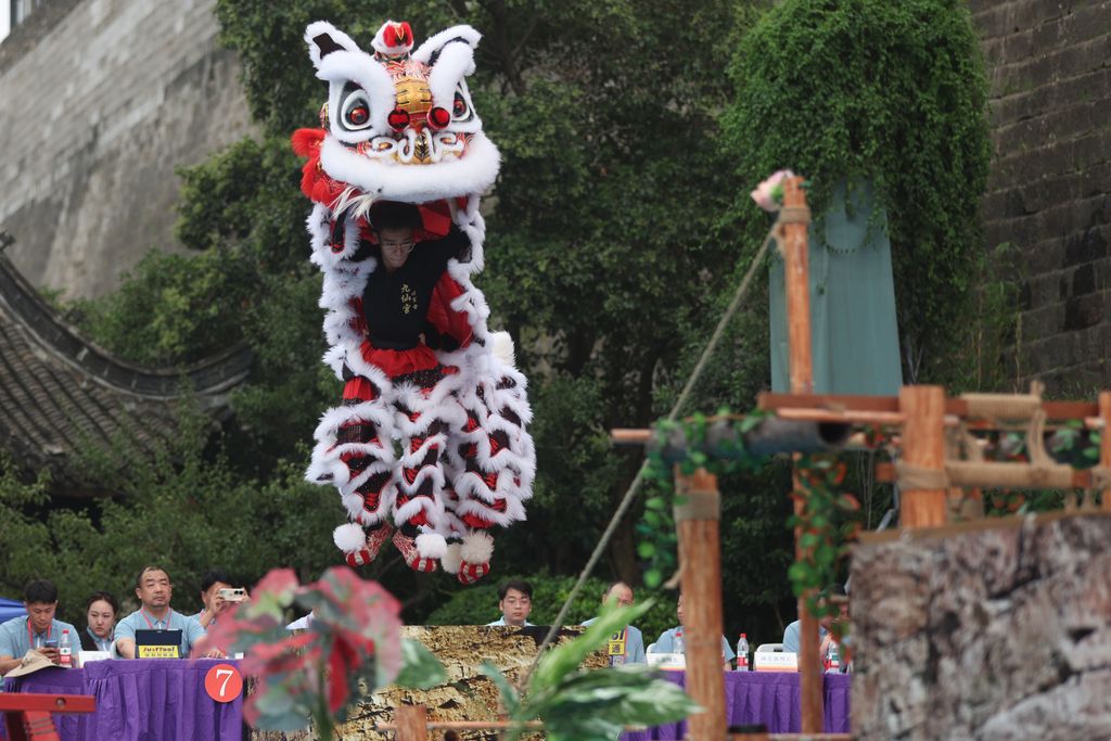 2025年9月27日,在江苏南京举行的2025年世界华人狮王争霸赛传统南狮项目的比赛中,来自中国、新加坡、南非、美国等国家的参赛队伍轮番登台展绝活。图为深圳市宝安区西乡蚝业黄连胜醒狮团的成员在比赛中。 中新社记者 泱波 摄
