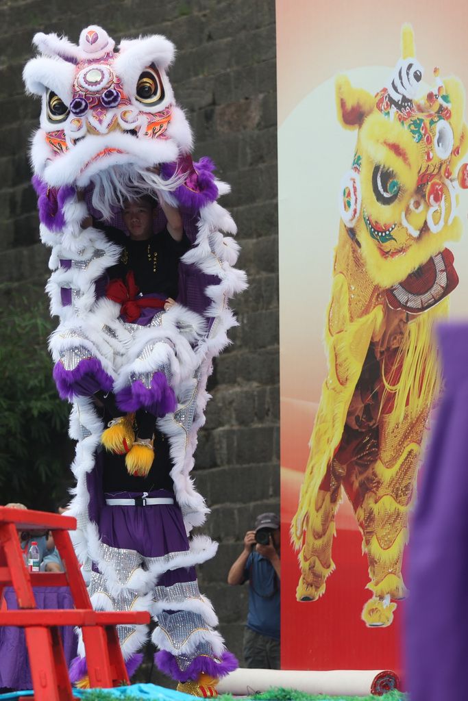 2025年9月27日,在江苏南京举行的2025年世界华人狮王争霸赛传统南狮项目的比赛中,来自中国、新加坡、南非、美国等国家的参赛队伍轮番登台展绝活。图为新加坡九仙宫体育会的成员在比赛中。 中新社记者 泱波 摄