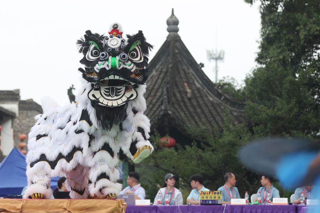 2025年9月27日,在江苏南京举行的2025年世界华人狮王争霸赛传统南狮项目的比赛中,来自中国、新加坡、南非、美国等国家的参赛队伍轮番登台展绝活。图为美国梁馆白鹤龙狮团的成员在比赛中。 中新社记者 泱波 摄