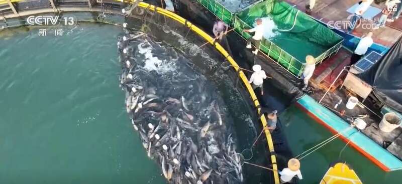 海洋捕捞迎来收获的同时,近海养殖产业也在迅速发展。在广东饶平县,深海网箱养殖基地迎来大规模收鱼作业。渔民们通过起网机将巨大的渔网底部逐渐收拢,网箱内鱼群涌动不息,水花激扬。