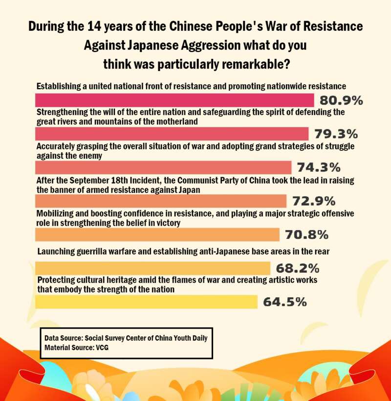 🔎 A recent survey by China Youth Daily Social Survey Center (10,306 respondents) found that 80.9% believe the most remarkable achievement was establishing the United National Front of Resistance and promoting nationwide resistance.