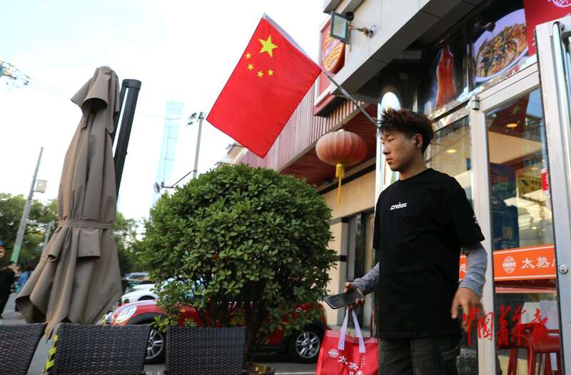9月28日,北京团结湖社区附近,一家门口插着五星红旗的饭店前,外卖员出门准备送餐。中青报·中青网记者 陈剑/摄