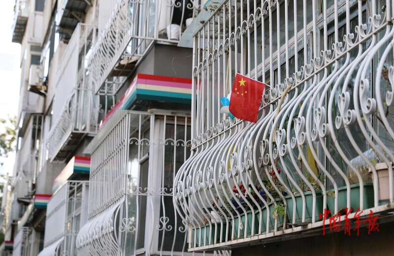 9月28日,北京团结湖社区,一户人家的阳台防盗网旁插着一面五星红旗。中青报·中青网记者 陈剑/摄