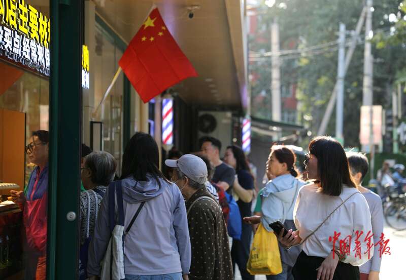 9月28日,北京团结湖社区附近,一家门口插着五星红旗的商户前,市民排队买糕点。中青报·中青网记者 陈剑/摄