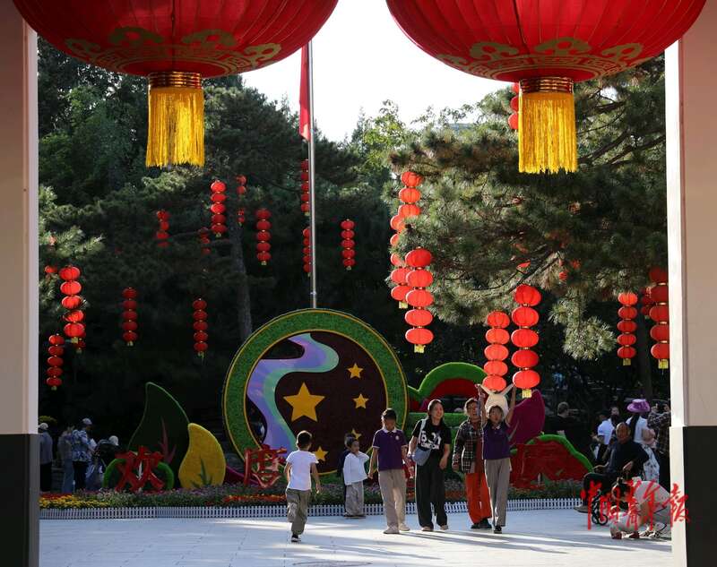 9月28日,北京团结湖公园,市民从五星红旗造景的花坛前经过。国庆节即将到来,首都大街小巷国旗飘扬,节日氛围渐浓。中青报·中青网记者 陈剑/摄