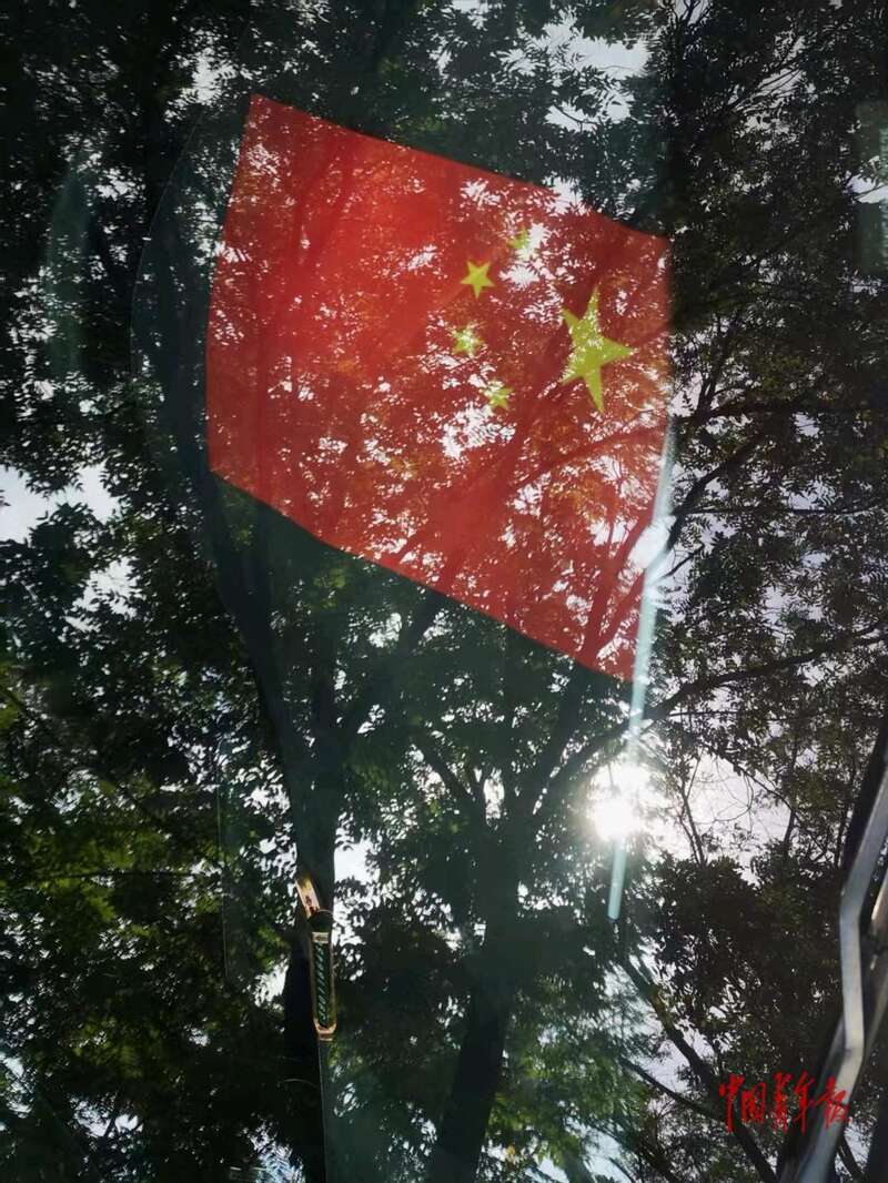 9月28日,北京街头,一辆小轿车的驾驶室放着一面五星红旗,挡风玻璃映照出斑驳的树影。中青报·中青网记者 陈剑/摄