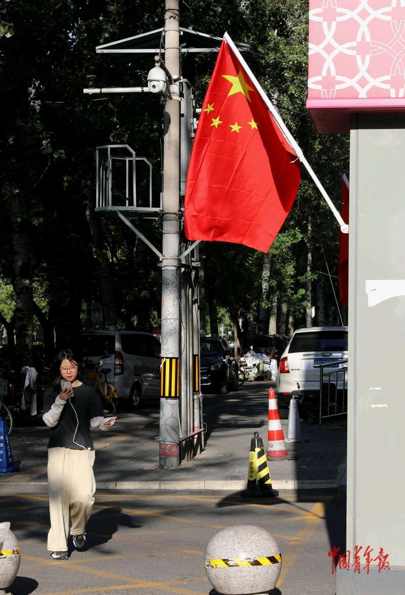 9月28日,北京团结湖社区附近,一位年轻人从一面五星红旗旁走过。中青报·中青网记者 陈剑/摄