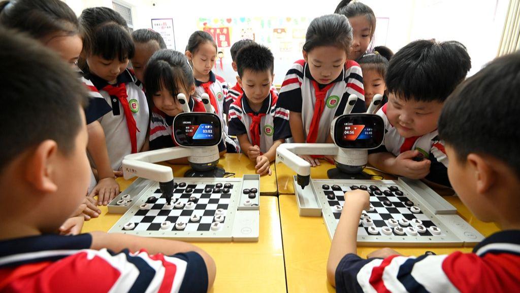 河北邯郸:对弈AI棋类机器人 校园里“棋”乐无穷