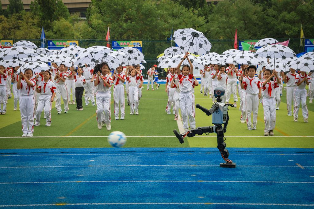 2025年9月27日,北京市“校园足球主题月”活动在北京学校启动。开幕式上,机器人进行开球表演。