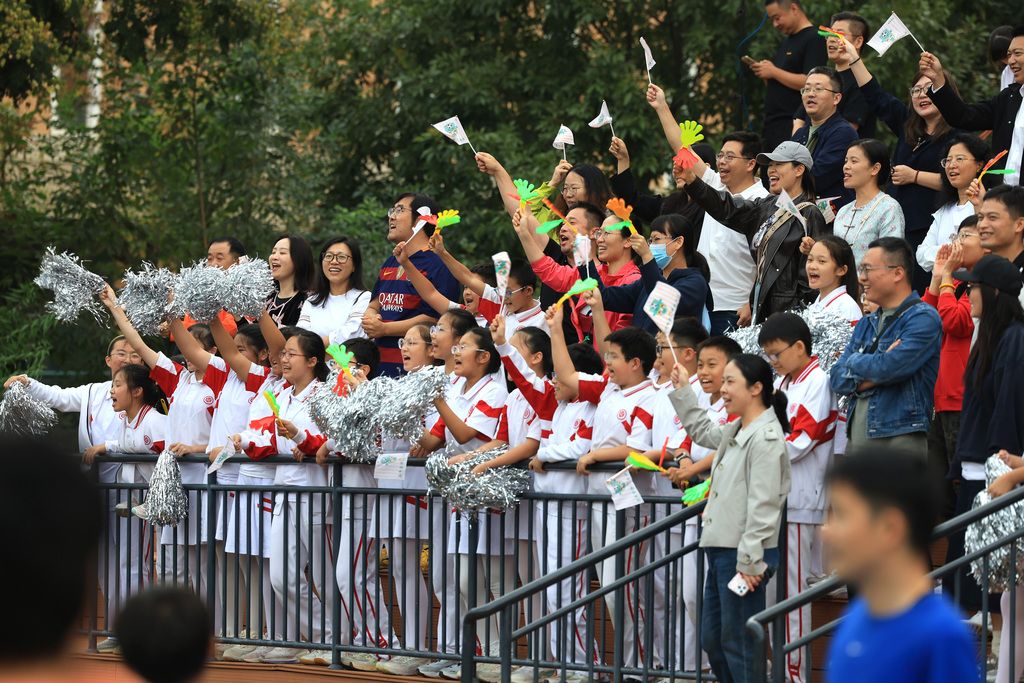 2025年9月27日,北京市“校园足球主题月”活动在北京学校启动。看台上,啦啦队大声地为场上队员加油。