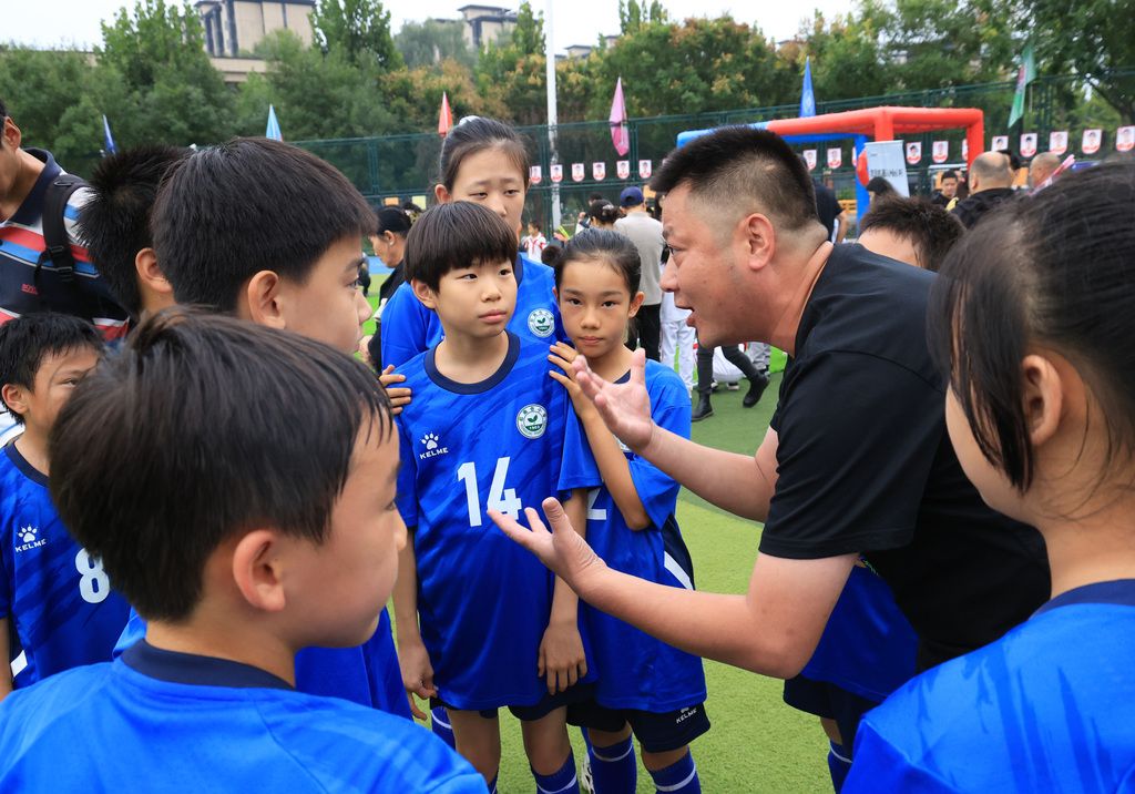2025年9月27日,北京市“校园足球主题月”活动在北京学校启动。中场休息,教练员对小队员们进行指导。