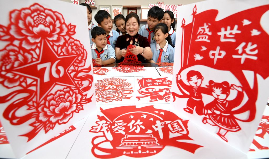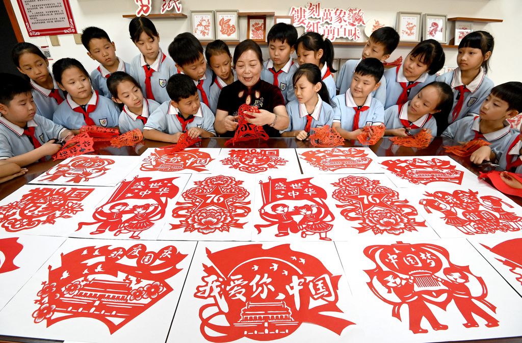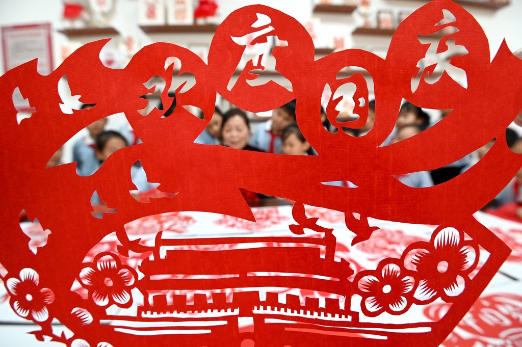2025年9月28日,河北省邯郸市,复兴区铁路小学开展“巧手剪纸迎国庆”活动,师生亲手创作国庆主题剪纸作品,以指尖技艺传递对祖国的热爱与祝福,喜迎国庆佳节。