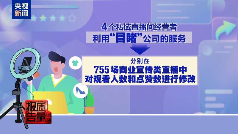 调查还显示,共有4个私域直播间经营者利用“目睹”公司的服务,分别在755场商业宣传类直播中对观看人数和点赞数进行了修改。
