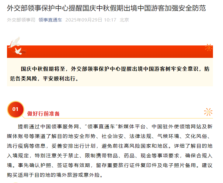 国庆中秋假期将至,外交部领事保护中心提醒出境中国游客树牢安全意识,防范各类风险,平安顺利出行。