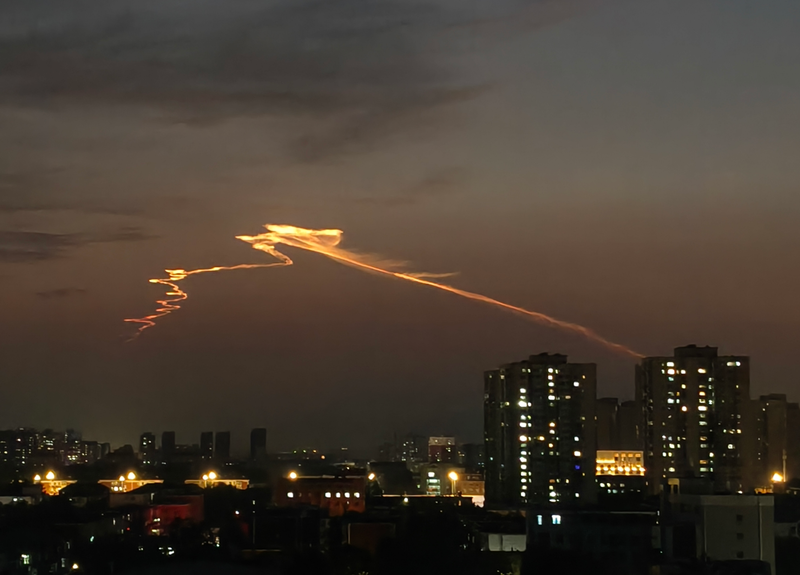 记者咨询了气象专家得知,原来这是火箭云,是由火箭尾气所形成的。这种云的高度极高,往往在大气平流层以上,所以在刚刚入夜后低空较暗,而高空仍可以被太阳光照到,因此在晴空时很大范围地区的天空都可以看到。由于此时在较暗的背景下,这种云就更显得特殊和壮观。