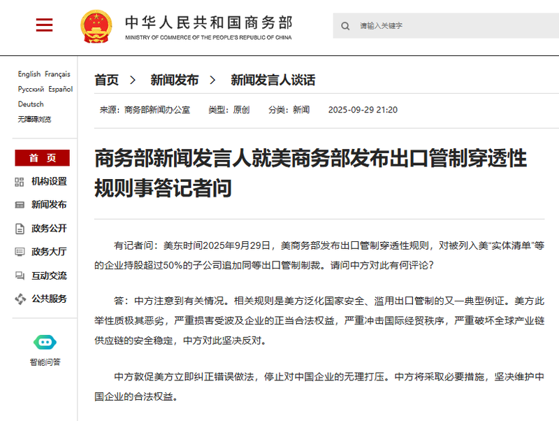 有记者问:美东时间2025年9月29日,美商务部发布出口管制穿透性规则,对被列入美“实体清单”等的企业持股超过50%的子公司追加同等出口管制制裁。请问中方对此有何评论?