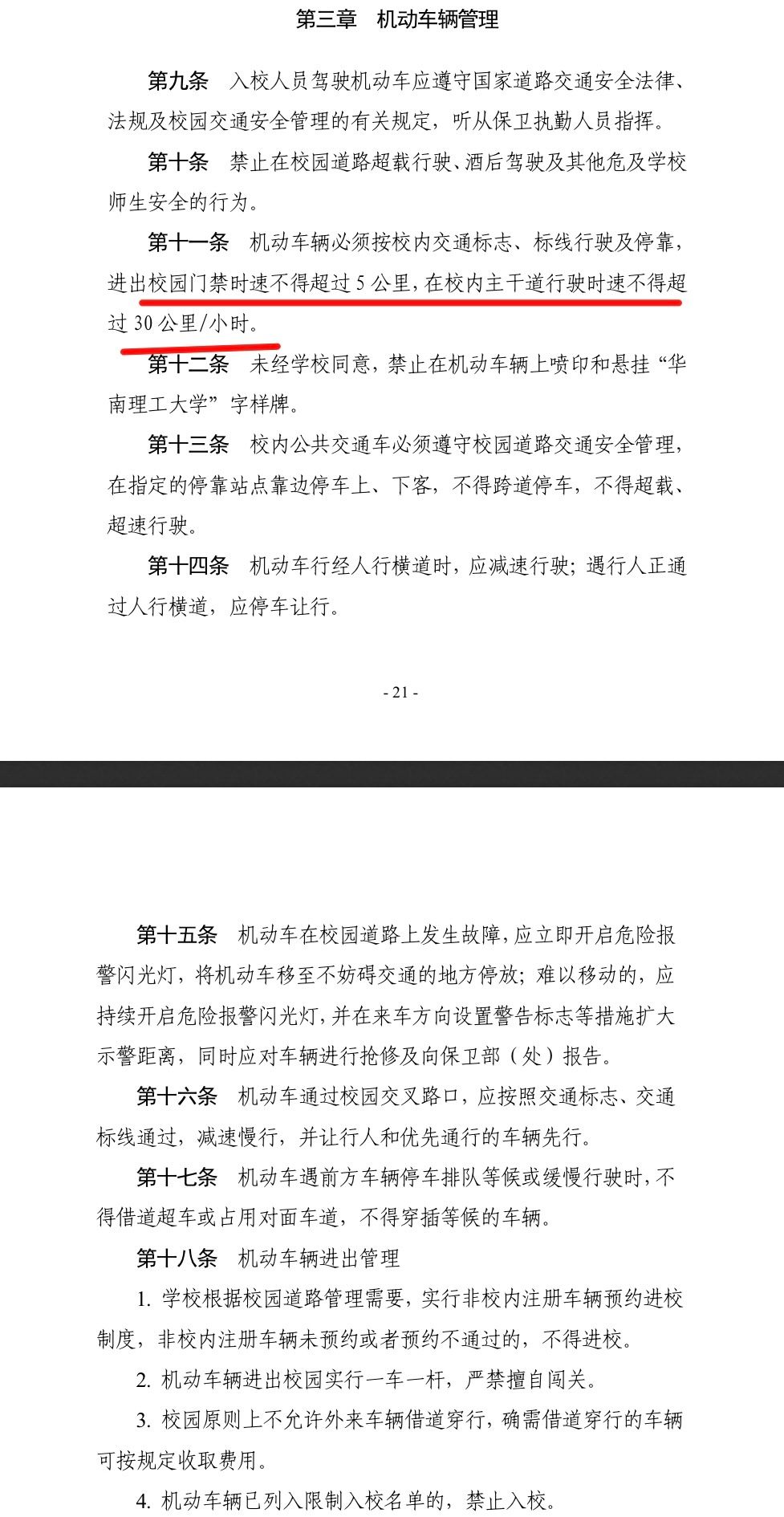 据华南理工大学官网消息,2016年7月,华南理工大学印发《华南理工大学校园交通安全和车辆管理办法》(以下简称《办法》)规定,保卫部门根据校园交通安全管理需要,在校园道路上设置各类交通标志、交通标线及车辆减速设施。机动车辆及驾驶人应遵守国家道路交通安全法律、法规及校园交通安全管理的有关规定,听从执勤人员指挥。