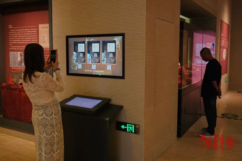 9月30日,北京首都博物馆“贺兰山下‘桃花石’——西夏文物精品展”现场,一名观众使用互动装置制作自己姓氏的西夏文海报并拍照留念。中青报·中青网记者 田嘉硕/摄