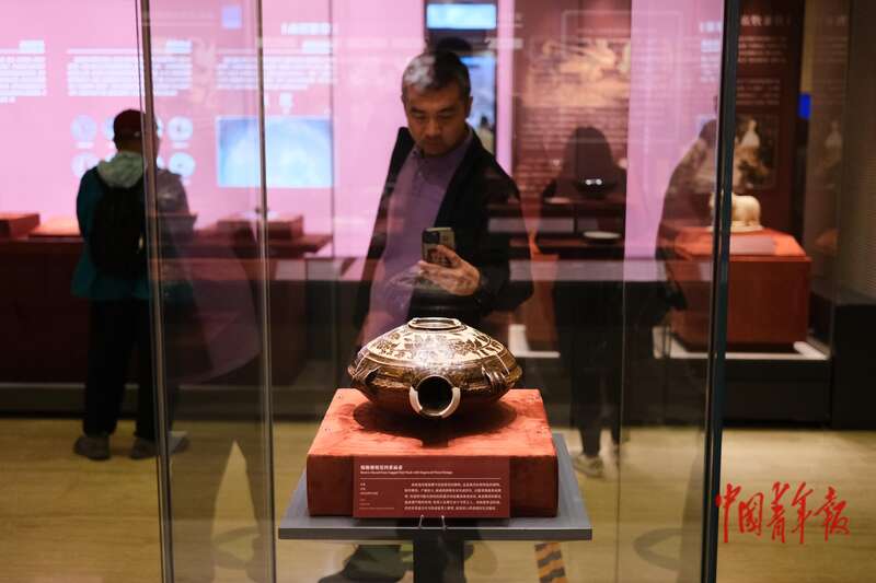 9月30日,北京首都博物馆“贺兰山下‘桃花石’——西夏文物精品展”现场,一名观众正在拍摄展品“褐釉剔刻花四系扁壶”。中青报·中青网记者 田嘉硕/摄