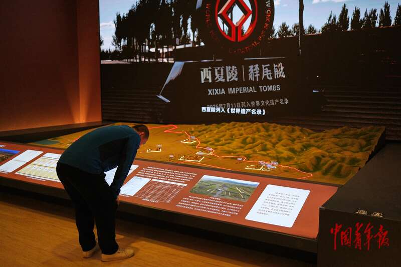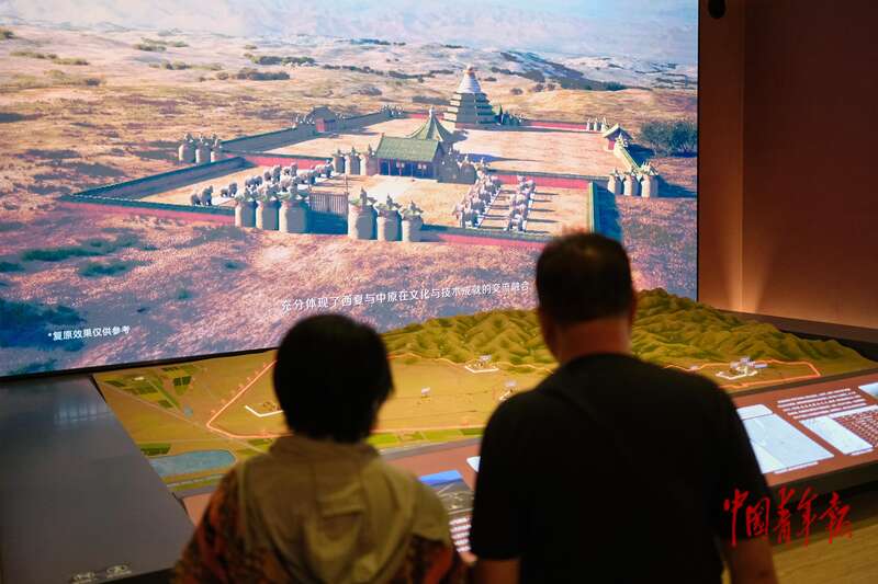 9月30日,北京首都博物馆,两名观众正在观看西夏陵沙盘和视频介绍。当日,“贺兰山下‘桃花石’——西夏文物精品展”亮相北京首都博物馆,作为西夏陵申遗成功后的首场西夏文明专题展览,展品全面呈现了西夏时期政治制度、生活方式、信仰形态与艺术风格。参展的103件(套)西夏文物精品中,有33件(套)一级文物,包括黑釉剔刻花四系扁壶、西夏荔枝纹金牌饰、石雕力士支座等,带你穿越千年时光,走近西夏历史,感悟中华文明的博大精深。展览将持续到12月14日,观众可以通过在首都博物馆小程序或公众号预约免费参观。中青报·中青网记者 田嘉硕/摄