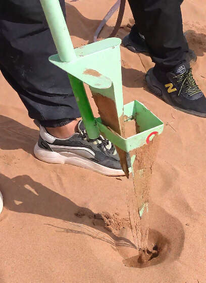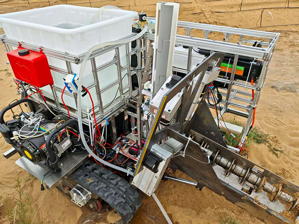 2024年初,这一结构被改装到传统的挖坑机上,手持中空挖坑机制作完成。那段时间,团队每隔几个月就要跑一趟民勤,在沙漠里不分昼夜地测试,不断地调试改造、整合优化,同时在当地开展一轮又一轮的调研,了解当地实际需求。