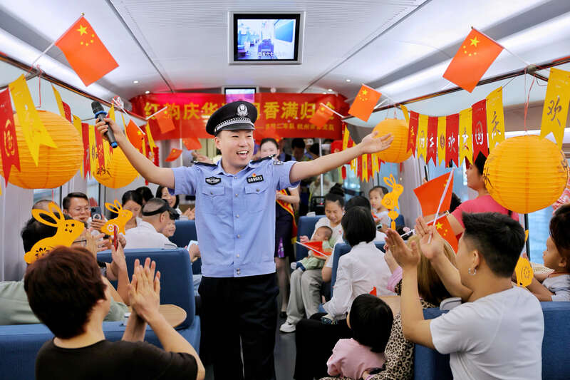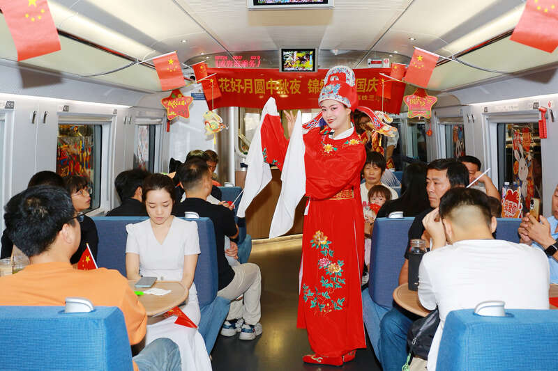 走进G7511次“西子号”列车车厢,浓厚的节日氛围扑面而来。列车行李架一侧陈列着1949年-2025年中国航天、军事发展的照片,从黑白影像到彩色画面,展示了新中国成立76周年的发展巨变,另一侧悬挂着杭州、北京等沿线城市的风景明信片;G7724次列车上,黄梅戏《女驸马》选段精彩上演,婉转的唱腔、地道的韵味,让旅客们近距离感受传统文化的独特魅力。