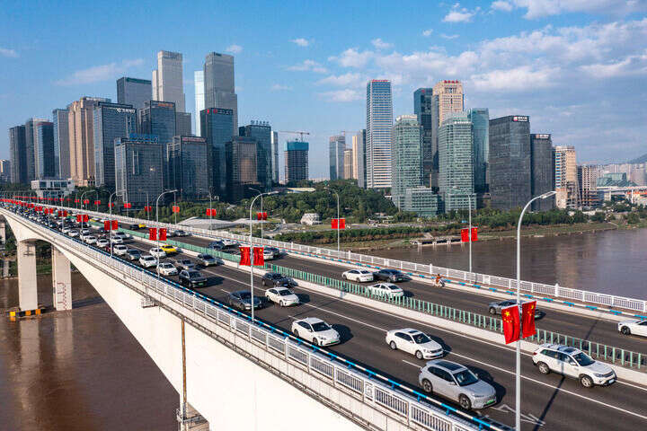 在全国多地,一座座跨江大桥披上“红妆”,串联成江上的红色长廊。市民涂琼站在武汉长江大桥上,望着国旗感慨:“这红色不仅装点了城市,更点燃了我们每个人心中的家国情怀。”