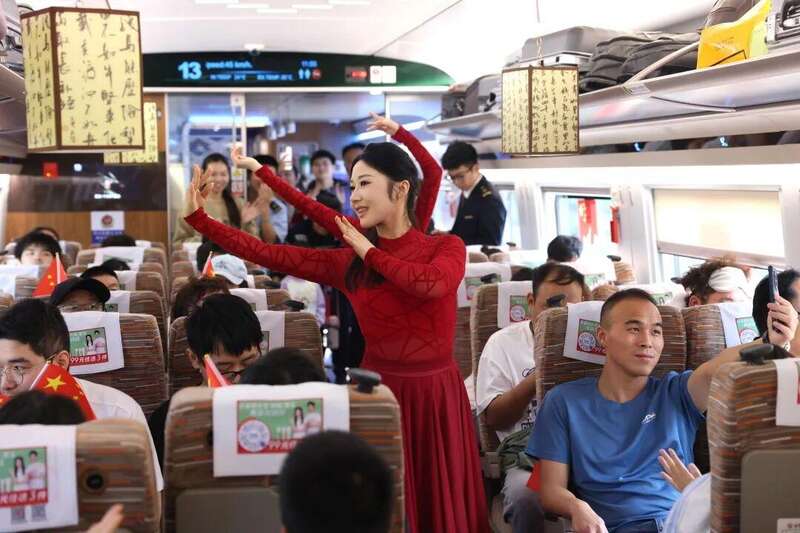 西安动车段随车机械师张中带来传统魔术《赤县神州》,将山河意象融入表演。西安机务段司机段成营唱响《我和我的祖国》,带动旅客大合唱。
